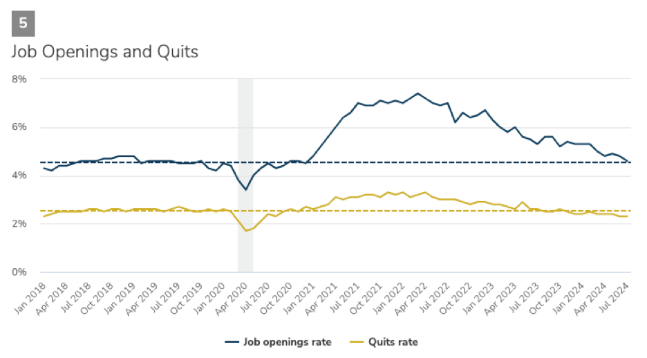 另外一个图则是空缺岗位和辞职率的情况。从图中可以看出,代表空缺岗位比例的蓝线已经回到了疫情前的平均,为4.6%,下面的辞职率则已经持续低于平均水平。这些都是JOLTS报告中的数据。我们可以认为,如果两个数据进一步恶化,那么就会增加美联储下次会议大幅降息的可能性。